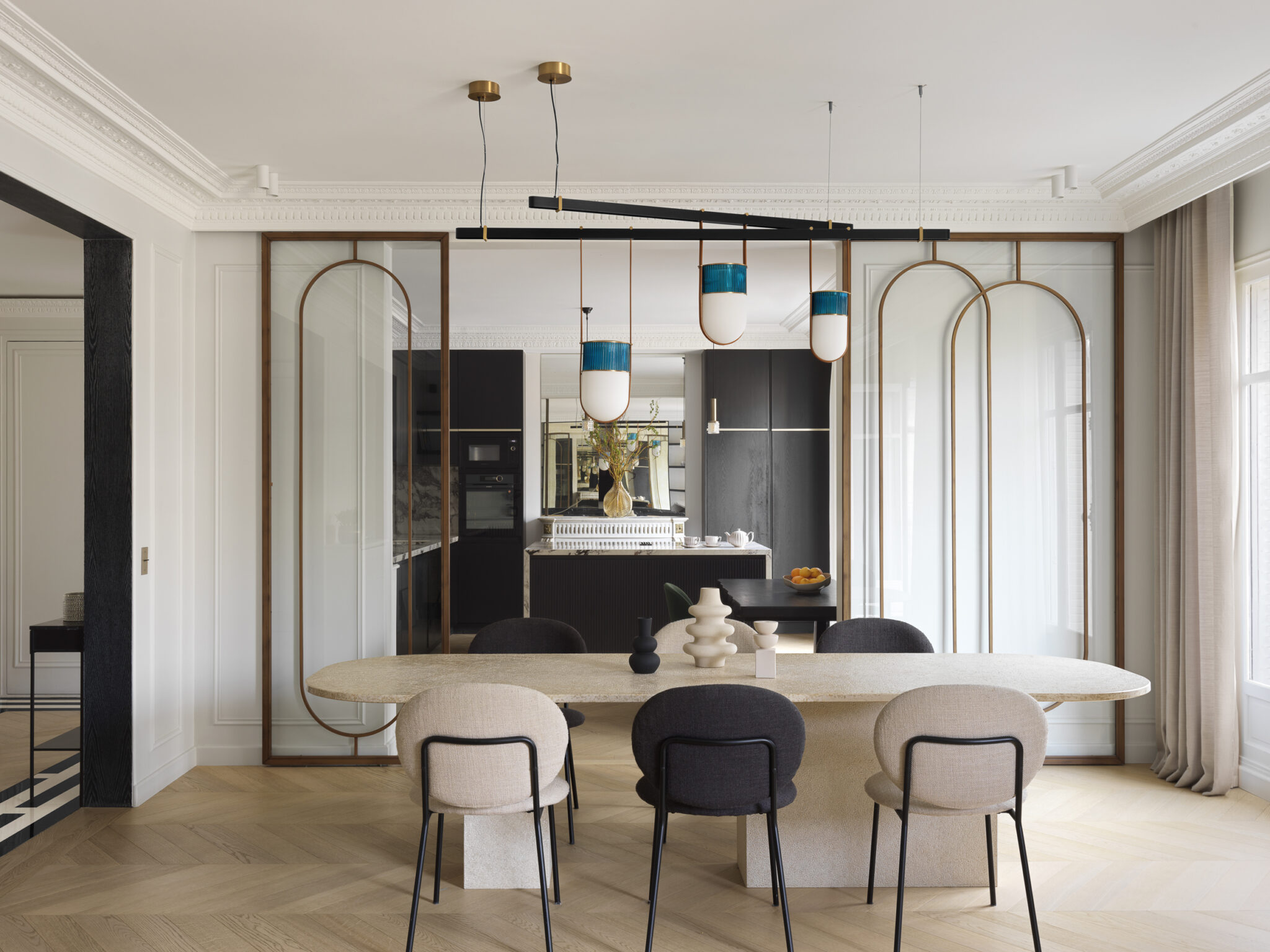 Un appartement de 260m² pour une famille avec deux petites filles. Éclairage périphérique : des lisières d’onyx rétroéclairé définissent les contours du sol de l’entrée. Note dorée : des éléments de couleur laiton apporte une douceur à la salle à manger théâtrale. Les cache-radiateurs et les portes du buffet intégré ont été façonnés en métal […]